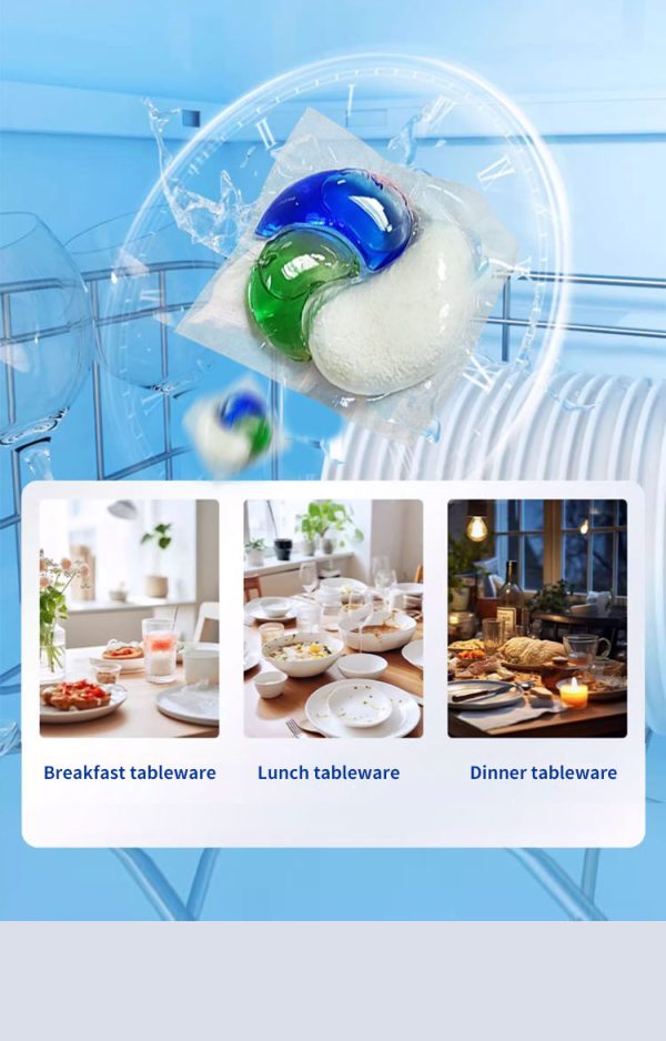Upgrade your dishwashing routine with our multi-functional dishwasher pods! Engineered to tackle tough grease, soften water for better cleaning performance, and bring out a brilliant shine on your tableware, these pods also help protect both your dishes and your dishwasher from damage. Featuring a high-efficiency, eco-friendly formula, they dissolve quickly and leave no residue—offering a hassle-free and sustainable way to clean. Reduce waste, maximize cleaning power, and keep your kitchen shining with a product that works hard while caring for the environment.
