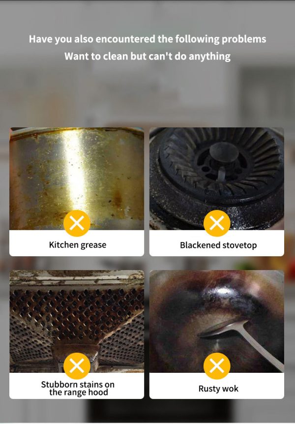 An all-purpose cleaning tool designed specifically for kitchen heavy oil scenes: it uses micro-grinding technology and a powerful degreasing factor compound to easily penetrate and disintegrate old oil stains, burnt stains and stubborn stains on the surfaces of stainless steel, iron pots, aluminum utensils, etc., and can restore the cleanliness of utensils without hard scraping. The mild formula does not contain strong acids and alkalis. While powerfully removing dirt, it protects the luster of utensils without damaging the coating and material. It is suitable for a variety of kitchen surfaces such as stoves, range hoods, baking trays, kettles, etc. The paste has a delicate texture and is easy to apply. It can produce rich foam when gently wiped with a sponge or a scouring pad. The oil stains are washed away with water. There is no residual odor after cleaning, which makes the kitchen utensils glow with a translucent luster, bids farewell to the cumbersome cleaning process, and saves time and effort to create a refreshing cooking space.